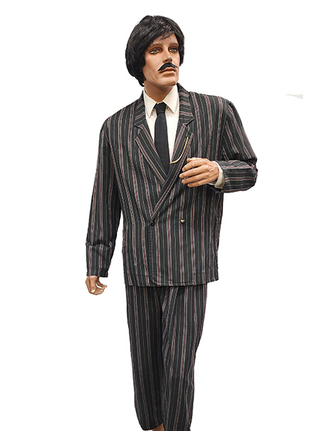 Gomez Includes a pinstripe suit, black tie, fob watch chain & optional white shirt. Stripes vary on many of our suits so the exact suit will depend upon what size you require.