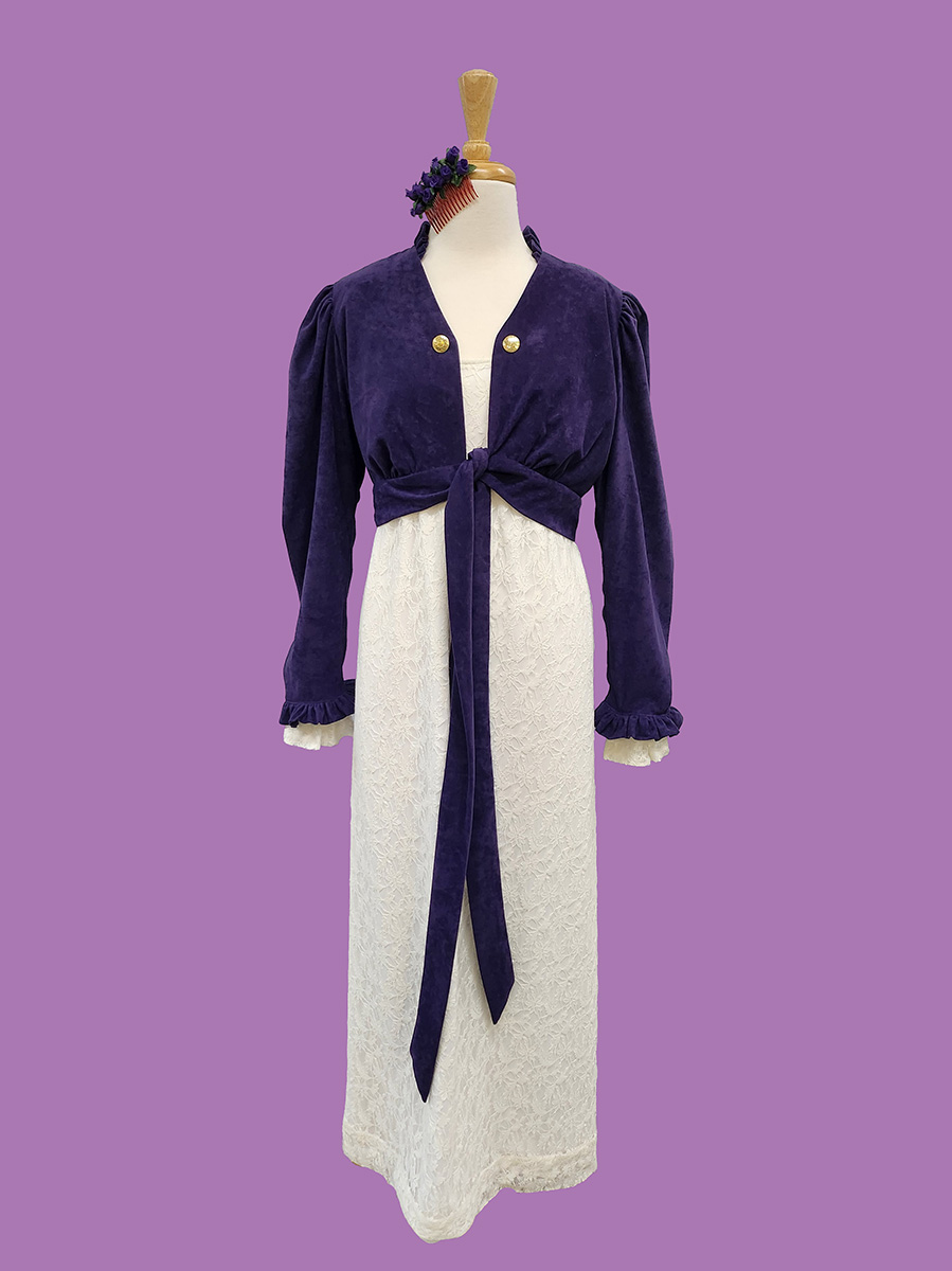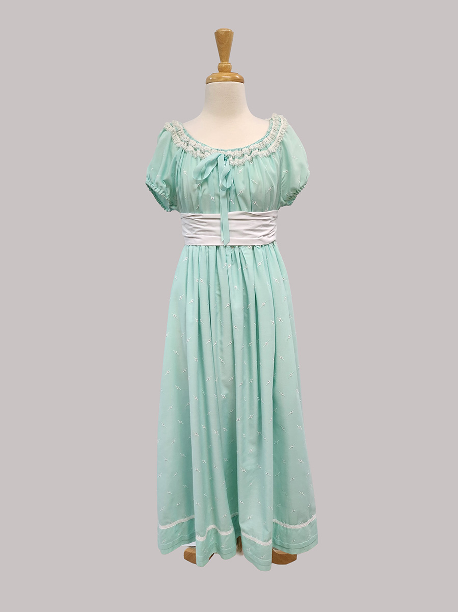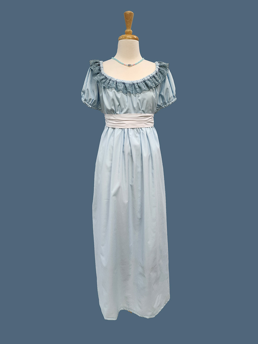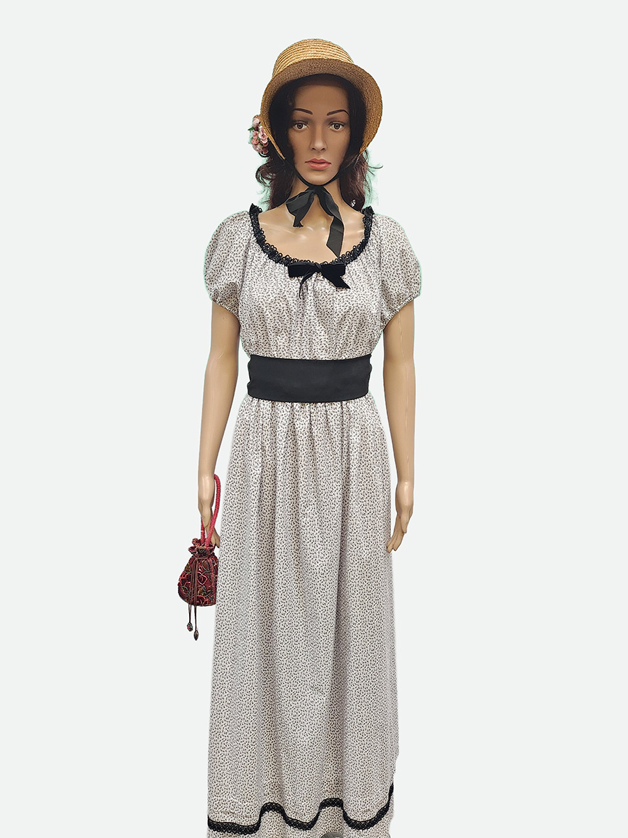 Includes a combination of dress or skirt & blouse, aprons, mob caps, bonnets, tiaras & shawls.