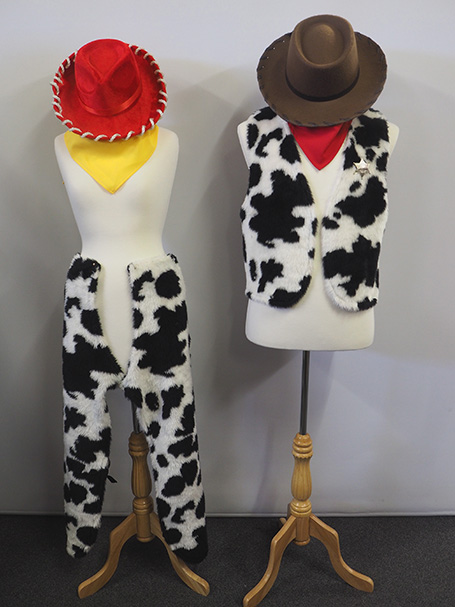 Jessie includes hat, scarf & chaps. Woody includes hat, scarf, vest & sheriff badge.